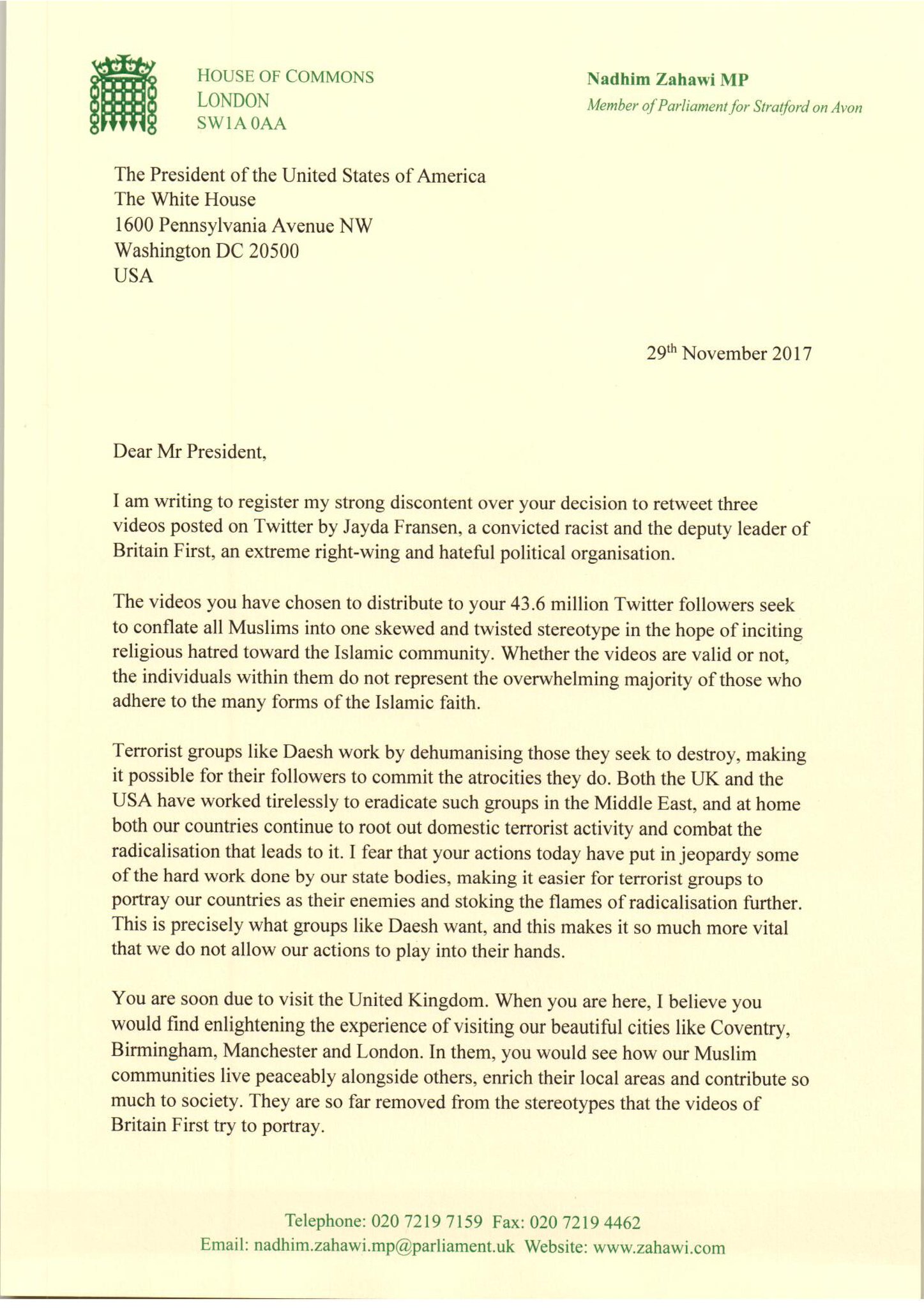 Nadhim Zahawi On Twitter My Letter To Realdonaldtrump Regarding Today S Retweets